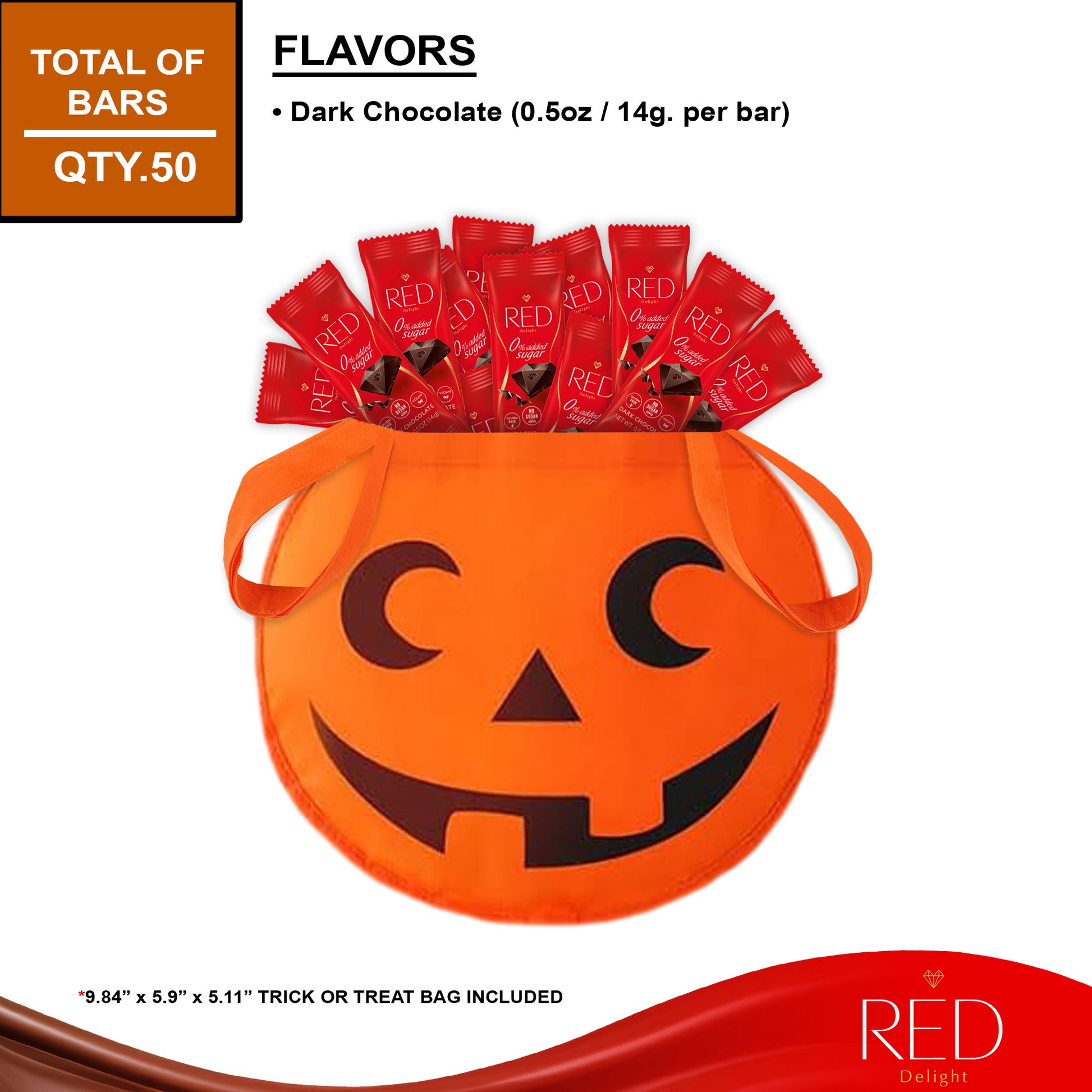 Celebrate this Halloween with the perfect treat — the RED Delight®™ 50 Count Bite Size Dark Chocolate Bars With 1 Halloween Trick or Treat Bag! These decadent, diamond-shaped chocolate bars are sure to enchant every candy lover and Halloween enthusiast. Each exquisite chocolate bar is individually wrapped. This exclusive Halloween promo includes 1 festive Halloween pumpkin bag, making it ideal for gifting, parties, or simply indulging in this season's sweetest celebration.