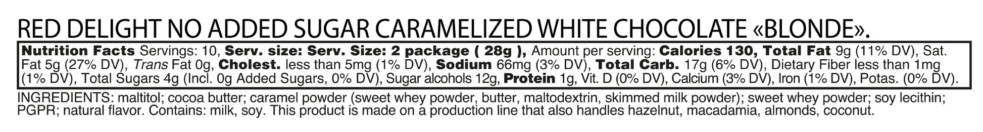 - Blonde caramelized white chocolate 0.5 oz bar: cocoa butter; maltitol; polydextrose; caramel powder (sweet whey, butter skimmed milk, maltodextrin); erythritol; whole milk powder; soy lecithin; PGPR; carrageenan; natural flavor.