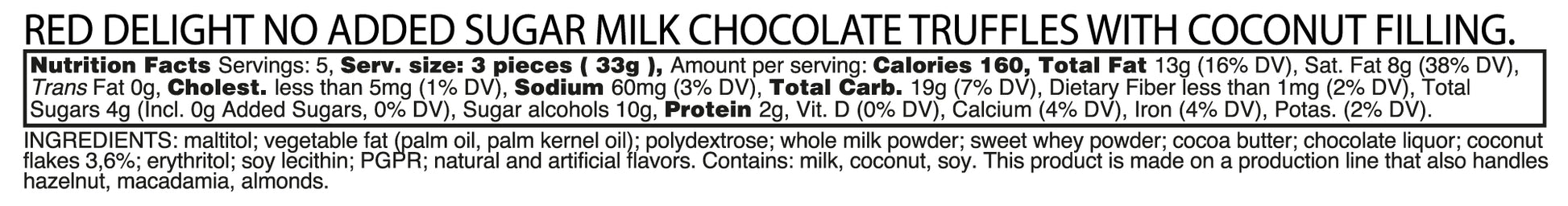 - Milk chocolate truffles with coconut filling: milk chocolate 50% (maltitol; polydextrose; whole milk powder; cocoa butter; chocolate liquor; sweet whey powder; erythritol; soy lecithin; PGPR; natural and artificial flavors); filling 50% (maltitol syrup; vegetable fat (palm oil, palm kernel oil, sunflower lecithin); skimmed milk powder; sorbitol; coconut flakes 3,6%; soya lecithin; PGPR; natural flavor). Contains: milk, coconut and soy.