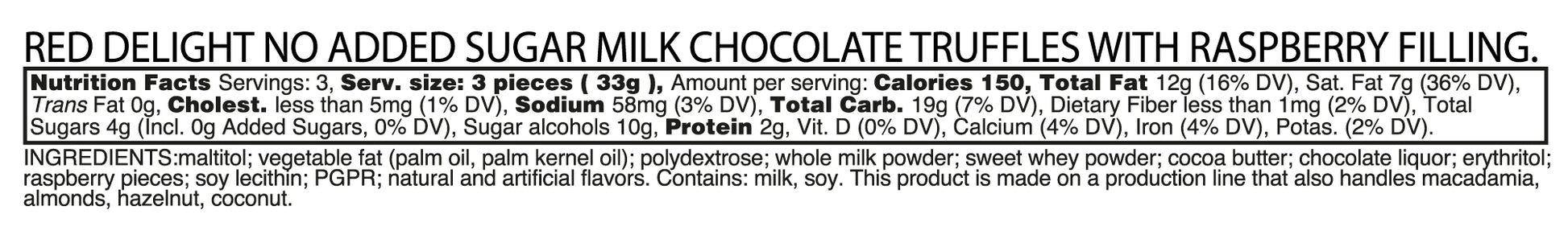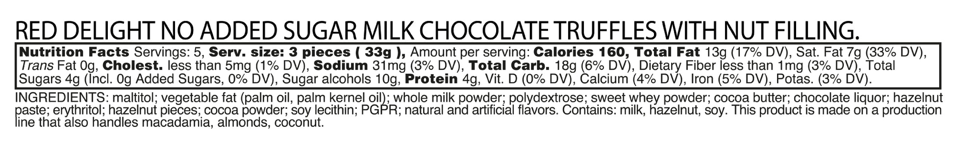 - Milk chocolate truffles with hazelnut and macadamia filling: maltitol; polydextrose; whole milk powder; vegetable fat (palm oil, palm kernal oil, sunflower lecithin); cocoa butter; hazelnut paste chocolate liquor; sweet whey powder; erythritol; hazelnut pieces; soy lecithin; PGPR; natural and artificial flavors. Contains: milk, hazelnut; macadamia; soy.