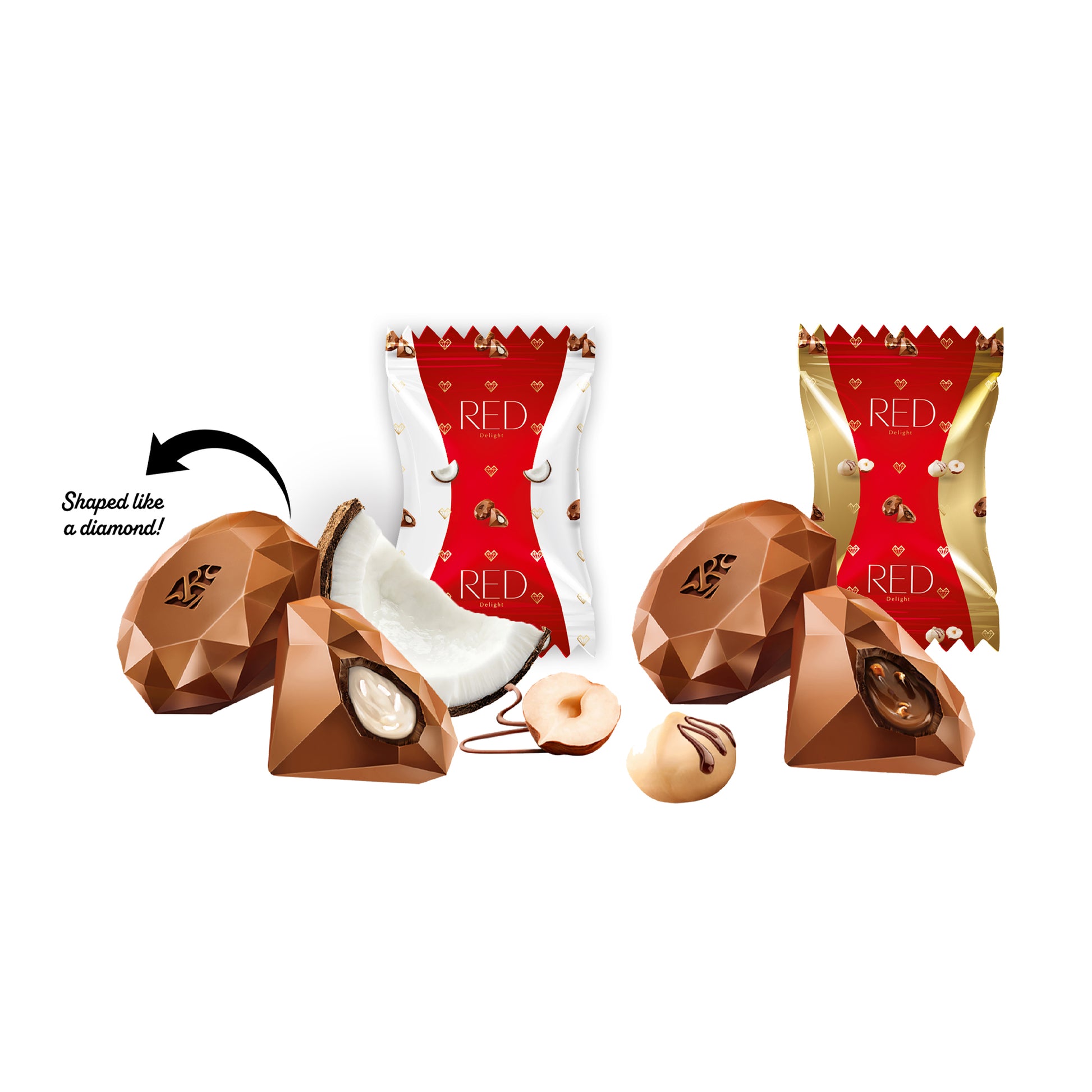 Give the gift of RED Delight®™ Chocolate. Savor our velvety milk chocolate truffles with a smooth coconut or hazelnut and macadamia filling. Indulge in bite-sized bars in milk, dark, and blonde caramelized white chocolate. Choose 1 of your favorite bite size chocolate bar flavors, a mixed variety of bite sized chocolate bars in all 3 flavors or a combo of both, truffles (in 2 flavors) and bite size chocolate bars (in all 3 flavors). Enjoy 100 individually wrapped chocolates in each gift box. Make the perfect birthday gift with a plush teddy bear, included with every gift box this holiday season.