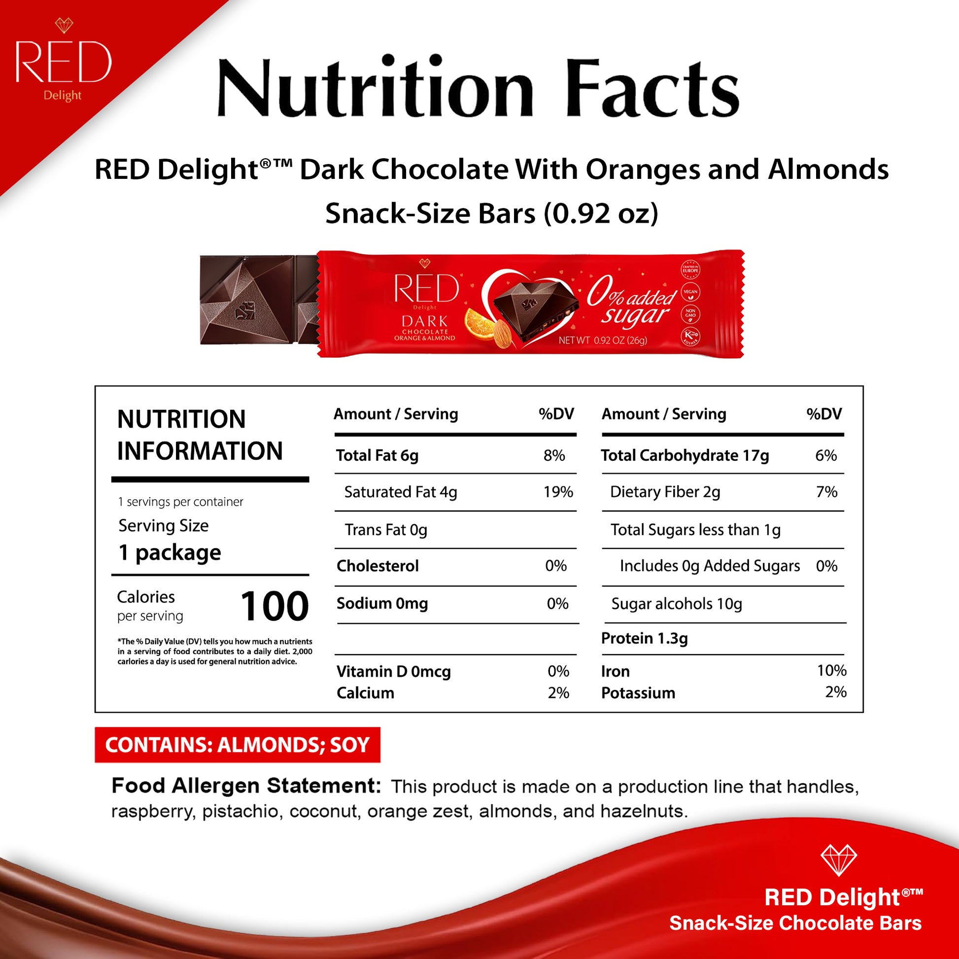 - Orange and almond dark chocolate 0.92 ounce bar: chocolate liquor, maltitol; polydextrose; almond pieces; orange zest; cocoa butter; soy lecithin; PGPR; natural flavors. Contains: almonds, soy.