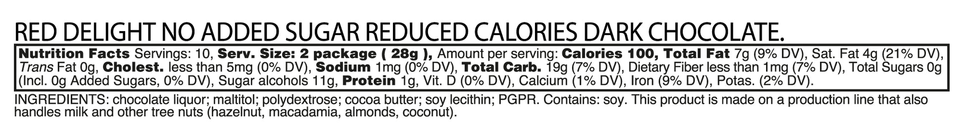 - chocolate liquor; maltitol; polydextrose; cocoa butter; soy lecithin; PGPR.
